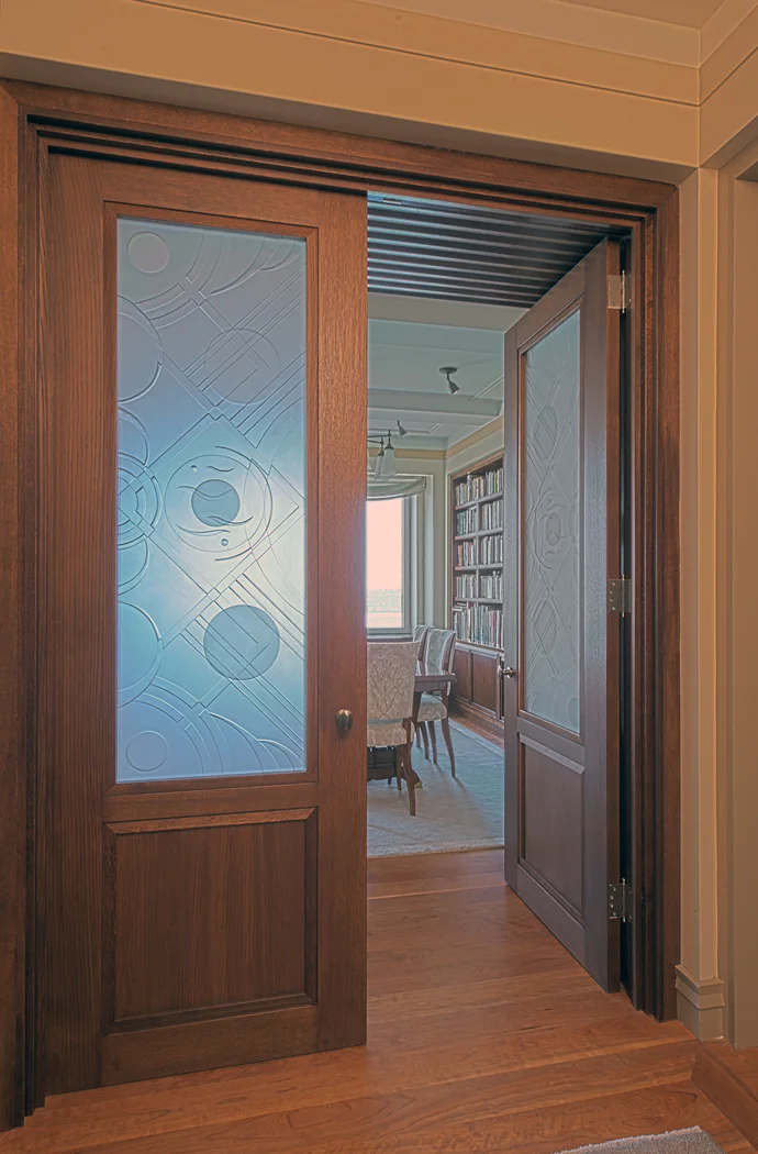 In a terrific Art Deco building on the Upper East Side, we renovated the living room, dining room, and entry foyer of a three-bedroom coop in that same style. Leo J. Blackman Architects had done work 15 years earlier on the private spaces (bedrooms, kitchen, study and baths). But with two children now teenagers, the owners sought shared spaces that would better accommodate their needs. The scheme employs faceted mahogany portals to separate the three public areas, and a continuous horizontal line (from window sill to cabinet top to panel divide) to bind them together. The fireplace surround uses the same wood trim, and a dark marble facing. Sliding doors with etched glass panels allow the rooms to be closed off from the foyer. New flooring, lighting and furnishings have been incorporated into the design.